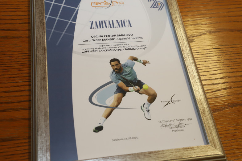 Tom prilikom uručili su mu zahvalnicu za podršku u realizaciji međunarodnog turnira „OPEN RCT BARCELONA 1899 – SARAJEVO 2025“.